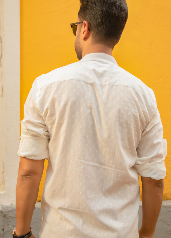 - Elevate your wardrobe with our 100% cotton Mandarin collar shirt, adorned with a self-design pattern, concealed cut pockets, and Mother of Pearl buttons.