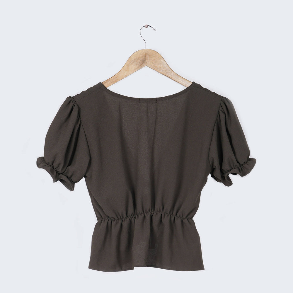 Solid olive green deep neck top made of factory surplus crepe material. It has an elasticated waistband, and puff sleeves and comes with a matching bralette.