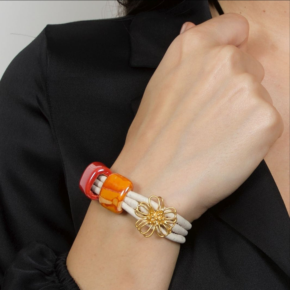 • Handcrafted in luxurious white cork and bejeweled in ceramic beads and Gold plated flower charm, the 'Flower & Light' Cork Bracelet is an Ode To our mother - Gaia.