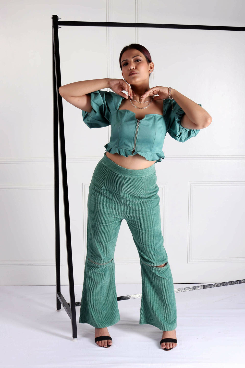 Get ready to add our MIA MYRTLE GREEN TOP to your closet in myrtle green! Crafted from a sumptuous hand-dyed gabardine and rayon fabric, Mia delivers a boned corset fusing with a front zipper opening that sculpts fit like no other. A distinctive neckline and ruffled hemline complete the pretty package that is your beloved Mia.