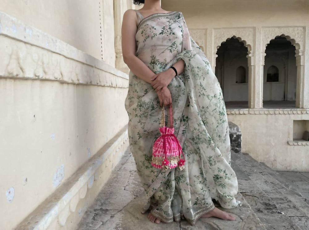 Pink potli bag comes in an up-cycle potli bag for better storage & in pre-used corrugated boxes