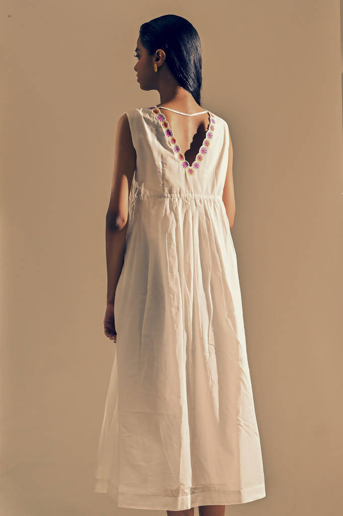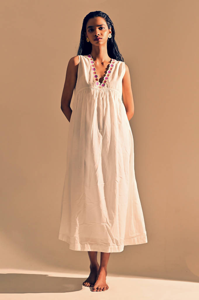 The Basra gathered dress has beautiful colored embroidery on neckline.