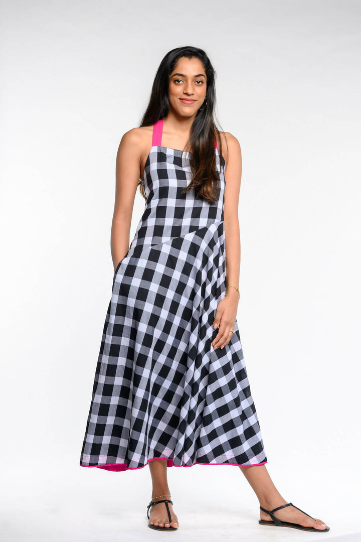 Black and white cotton flared maxi dress with pink straps, pink facing and piping at the bottom hem.