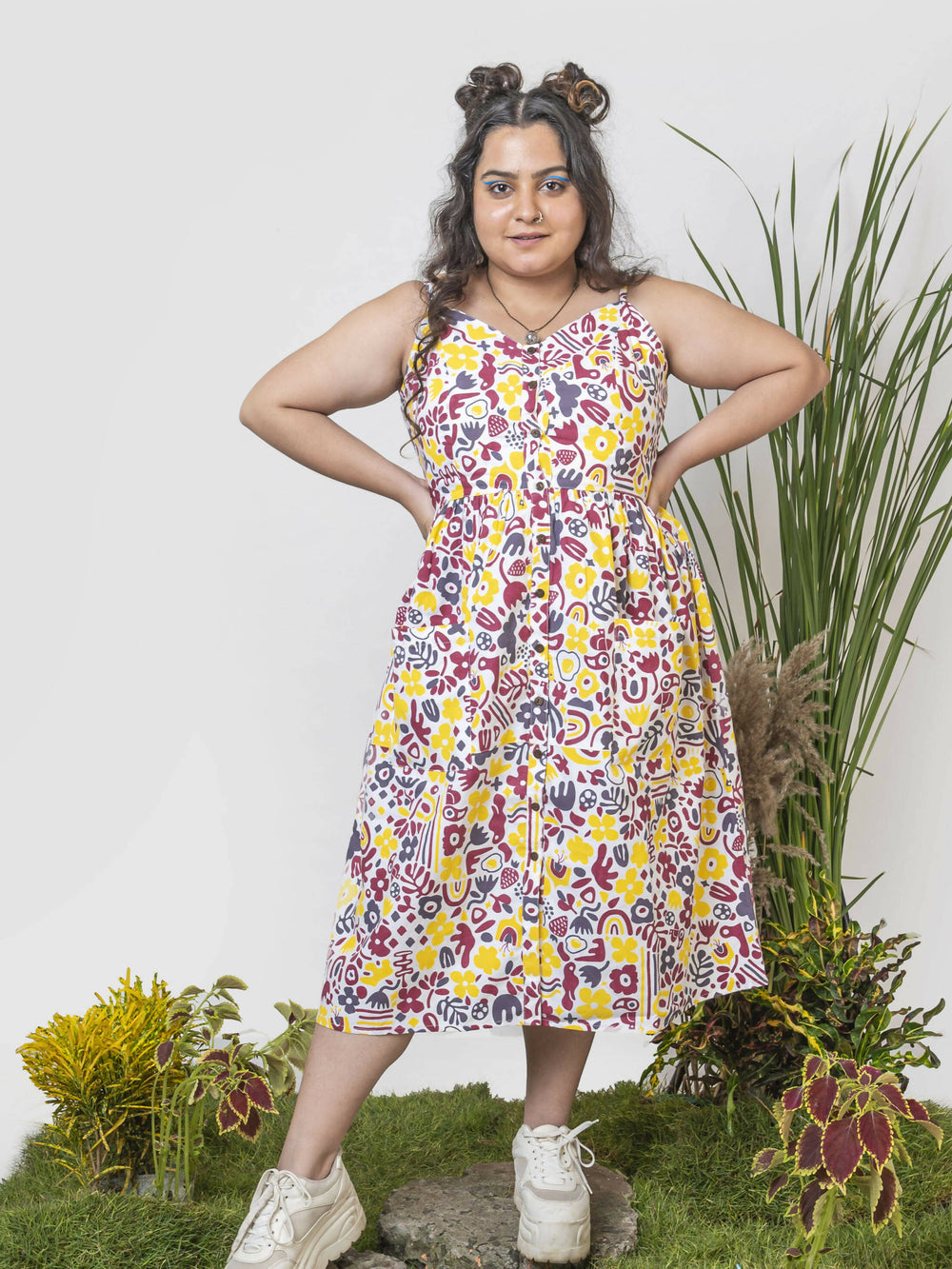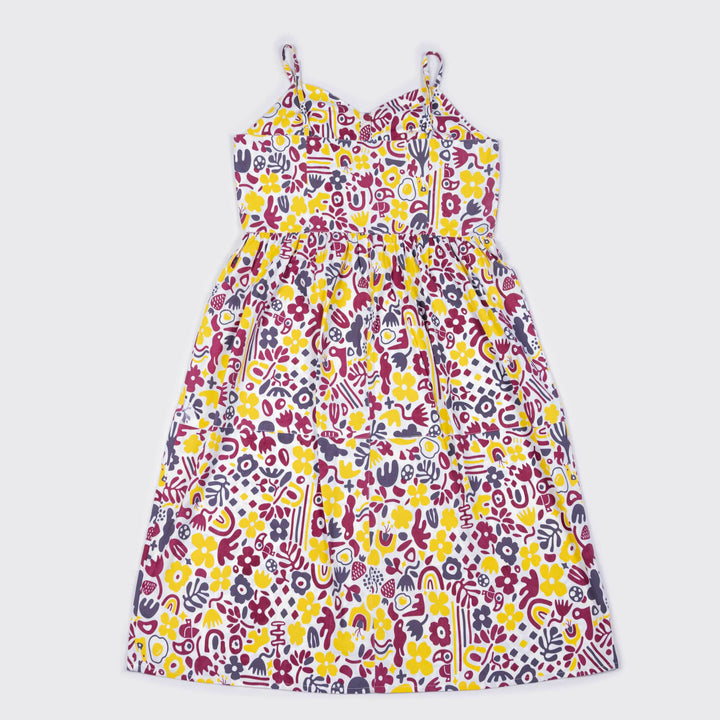 • This pretty Coney Island Strappy Dress exhibits a medley of pink, purple, and yellow hues in it's print.