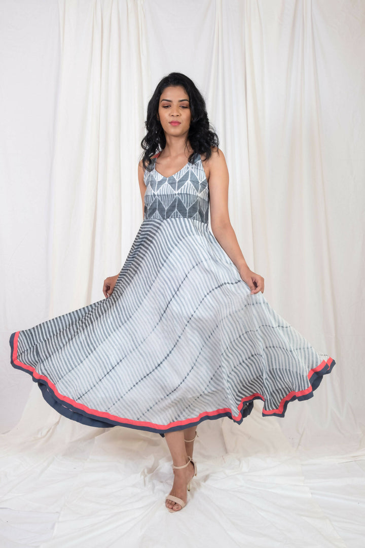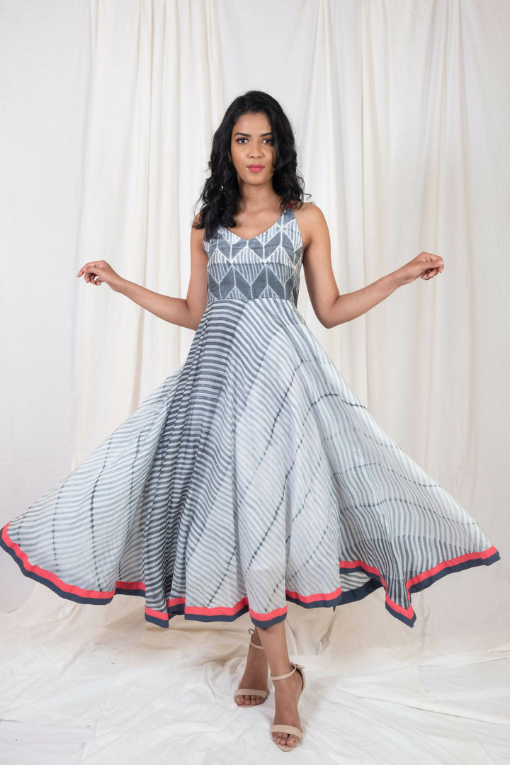 Intricate shibori vegan silk Empire line asymmetric dress with a flowy silhouette & noodle straps bodice.