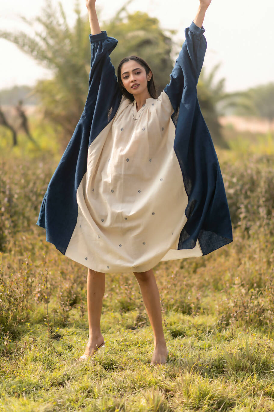 - This duo box dress, in shades of cream and indigo, boasts a unique design featuring a half band collar with a V cut. The batwing sleeves lend a trendy, contemporary feel, while the cuff detail enhances the overall aesthetic of this dress.