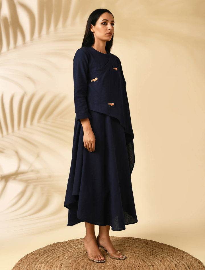 The Indigo Cape dress is crafted in lightweight Cotton . The attached cape on the dress holds thread embroidered bird motifs on it. Style this up with stack bracelets and a pair of strappy sandals. It is comfortable and perfect for all seasons.