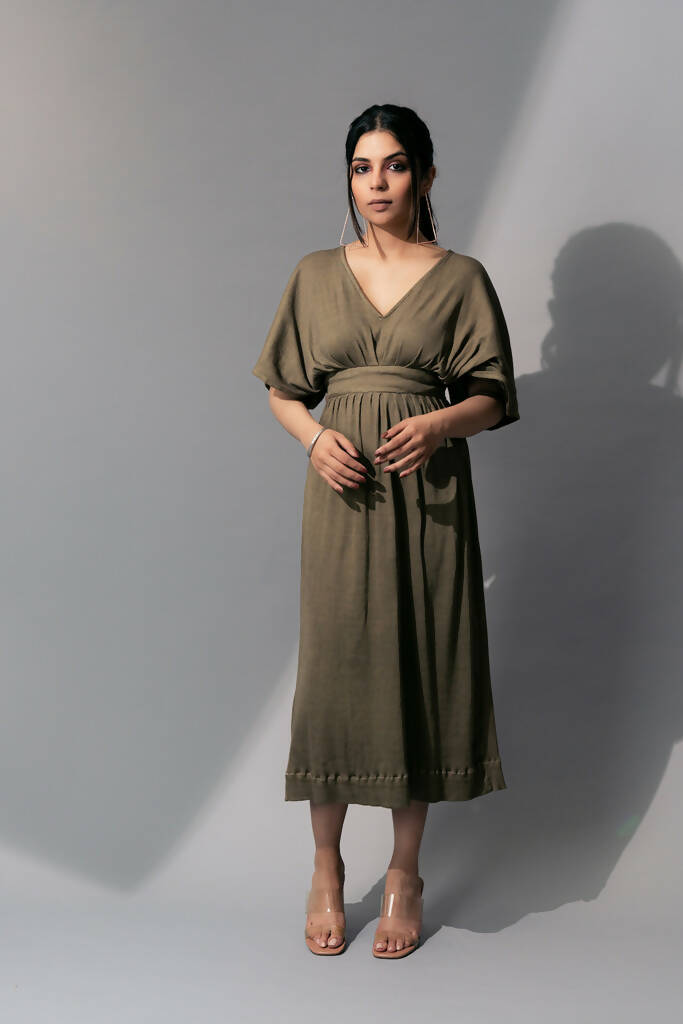 - Wear this dress with tan coloured heeled sandals, a tote, and minimal jewellery.
