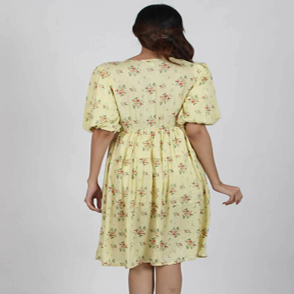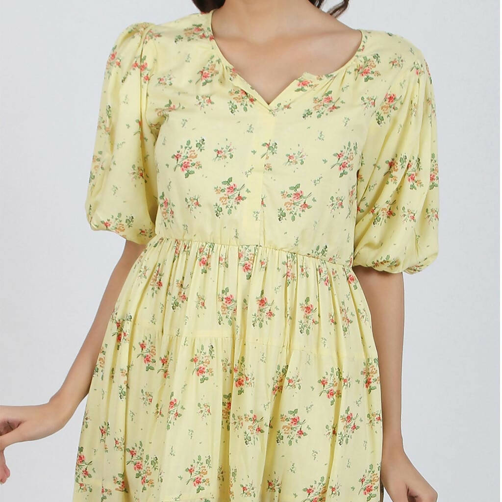 The modal tier butter dress in a soft yellow colour is made with CottageCore softest SF fabric. It features a voluminous tiered silhouette with a V notched neck and balloon sleeves. This midi dress is breezy and has a relaxed fit making it a fabulous pick for days spent in the sun or picnic with your girls or just spending a relaxed day at home.