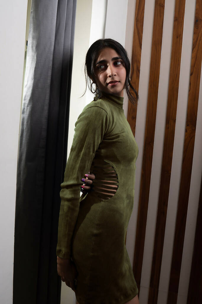 - This high-neck, bodycon dress is accentuated with waist slits, naturally dyed with indigo, and crafted from fine cotton rib. It is available in indigo, black and olive green.