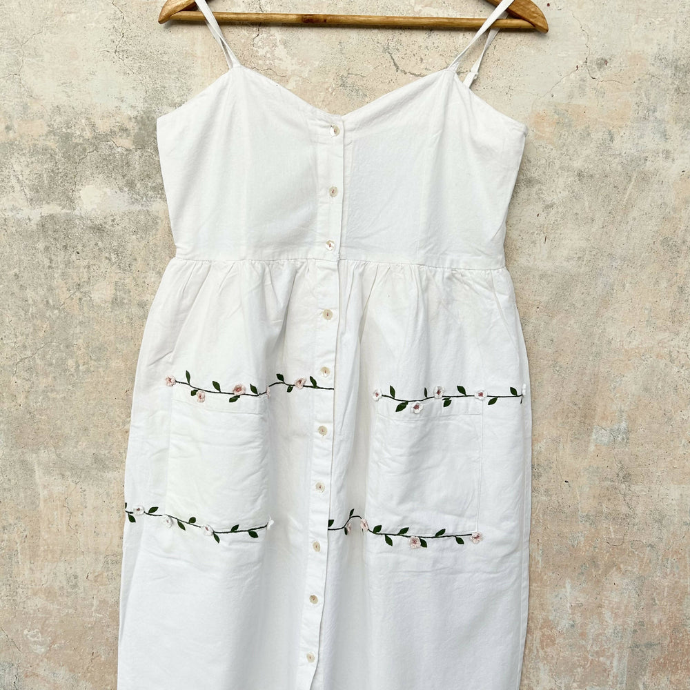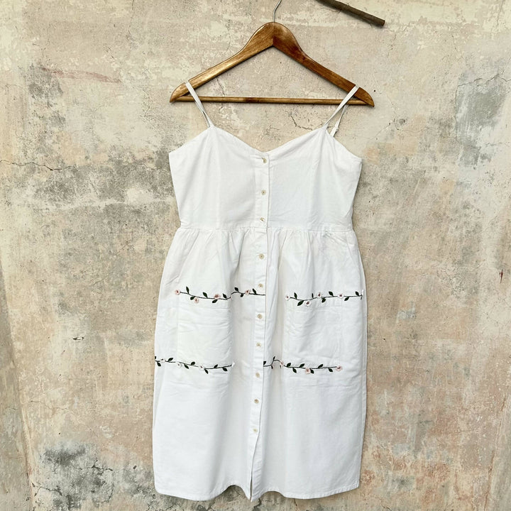 - Thoughtfully crafted from end-of-roll fabric with zero wastage, this A-line fit dress features shell floral cut buttons, hand-painted leaves, and crochet-detailed flowers.