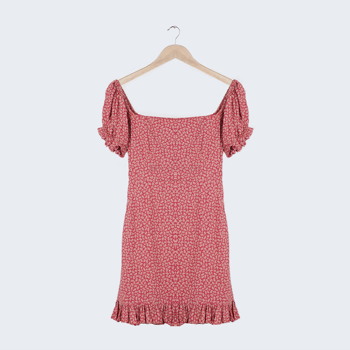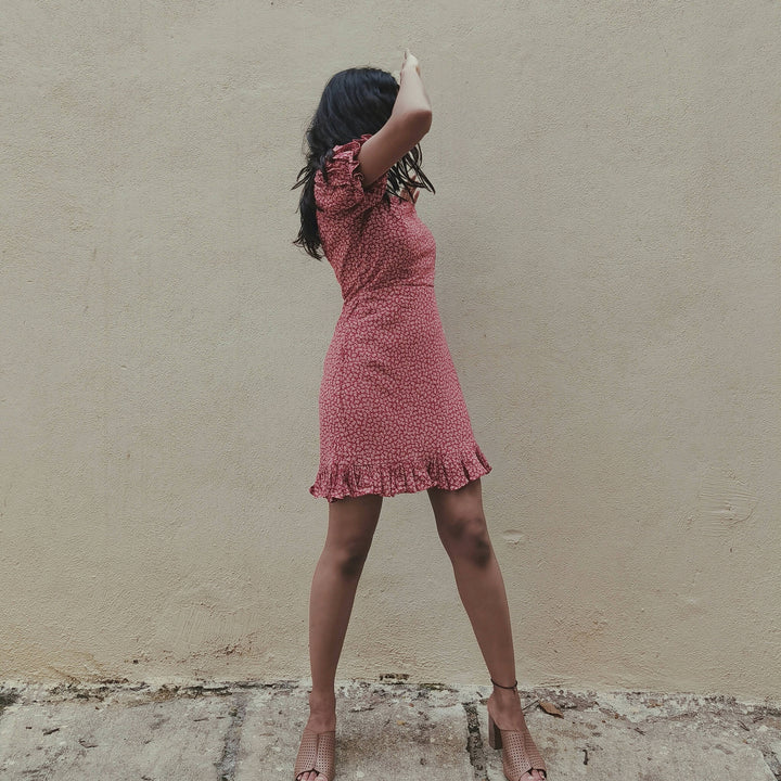 Bodycon ruffled dress in brick red color, made of factory surplus crepe material. Has floral ditsy print and puff sleeves.