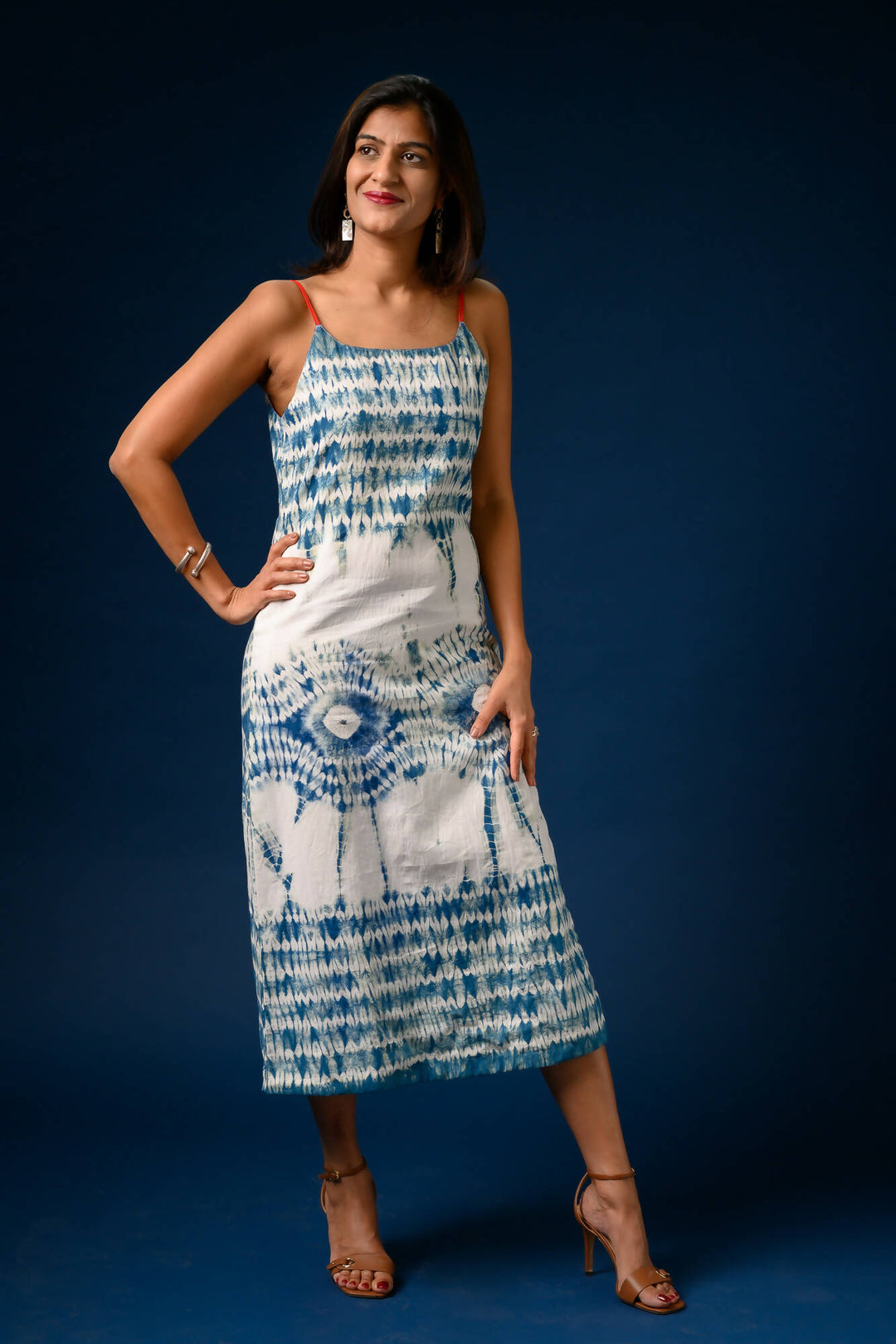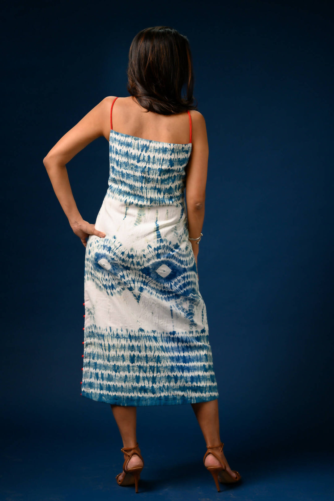 Natural dyed n Handcrafted shibori dress with noodle straps and side slit on the left with detailing.