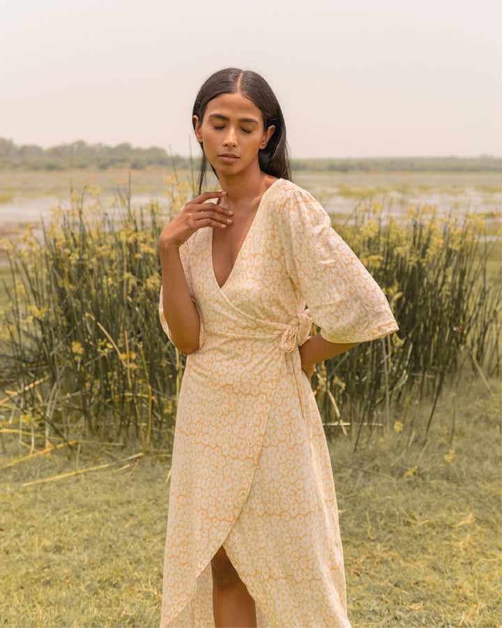 Fun, lightweight midi length dress that wraps romantically at the waist and falls beautifully beneath.