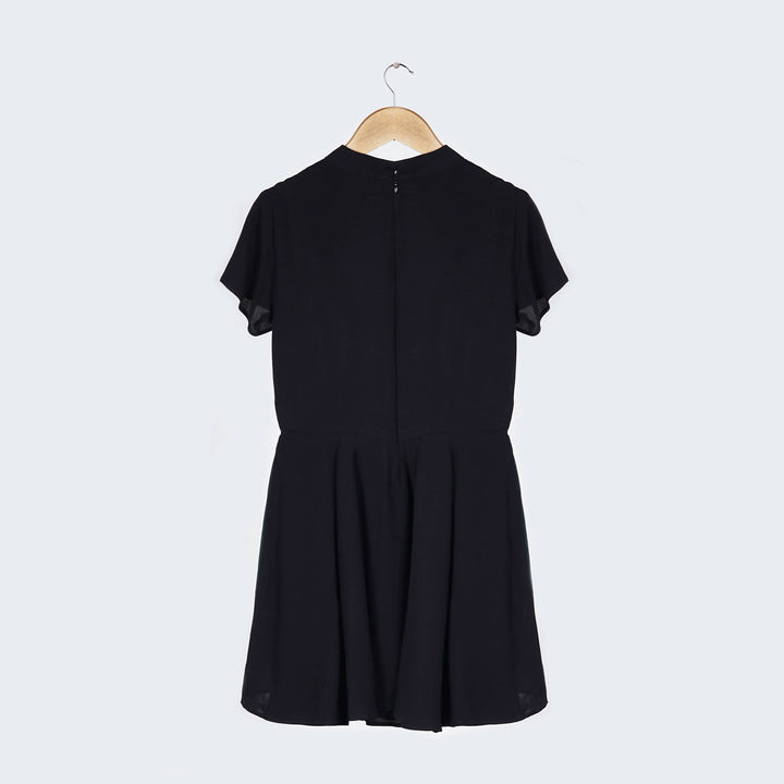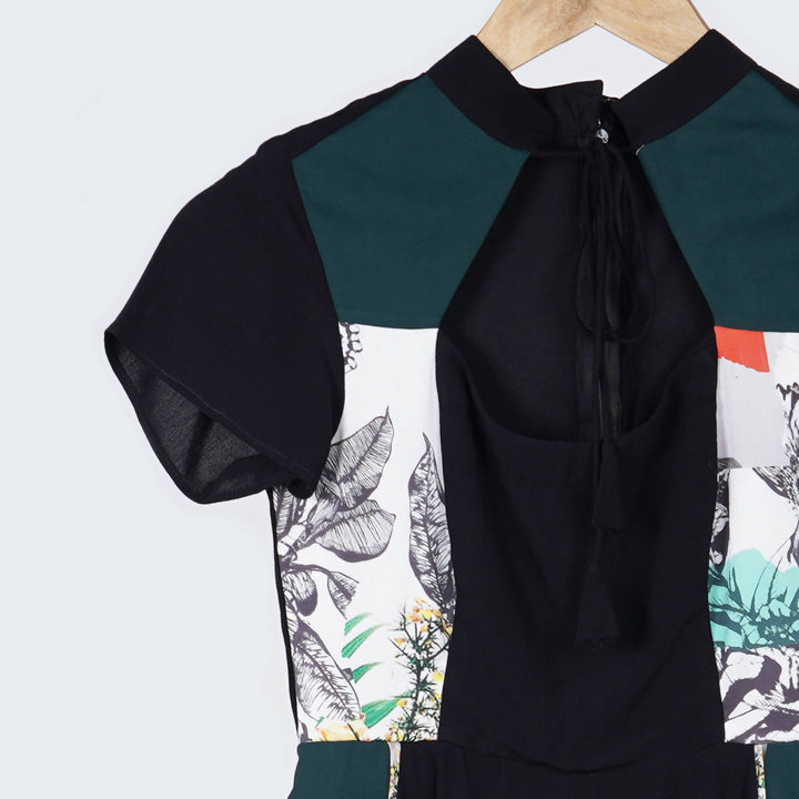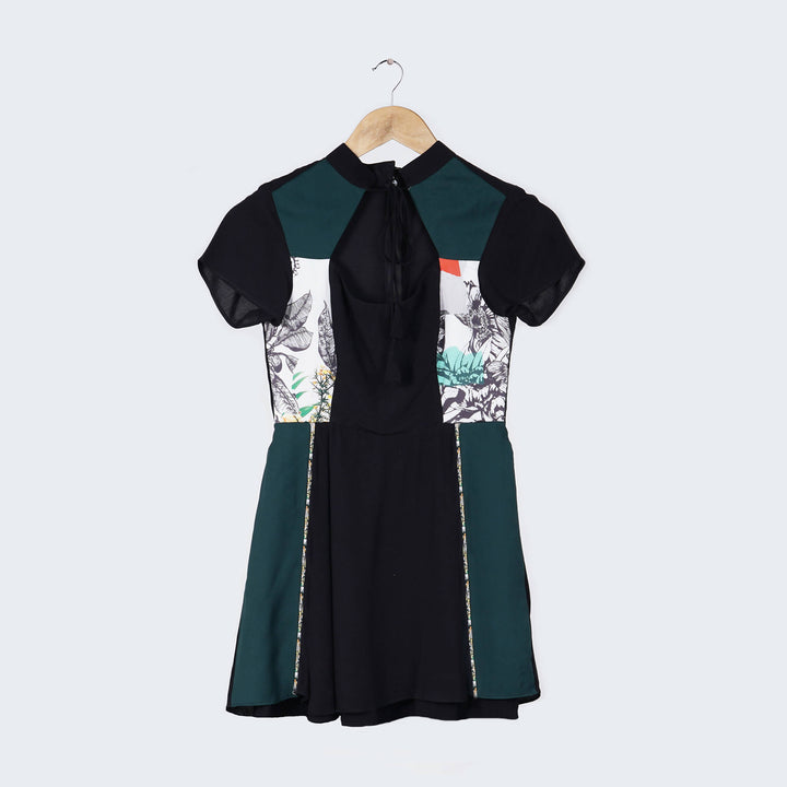 - Crafted from georgette and polyester, this mini length, umbrella-style dress features a vibrant tropical color scheme and is designed with tie-ups around the neck.
