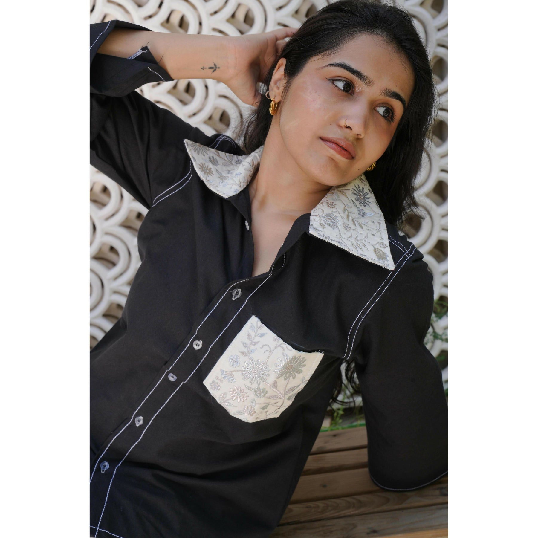 - The shirt features a collar and a patched pocket detailed with silver floral embroidery using Zari thread, that catches the light beautifully.