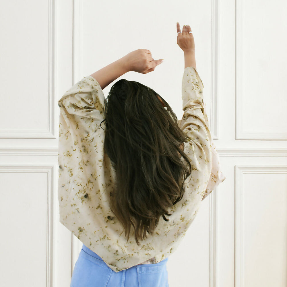Crafted from soft and breathable handwoven cotton sourced directly from local weavers, our 'Bagh' box top supports traditional craftsmanship. We use dried rose petals for natural dyeing, offering a sustainable alternative to harmful chemicals. The V-neckline and bell sleeves create a romantic silhouette, while the boxy style ensures a relaxed fit suitable for everyday wear or evenings out.