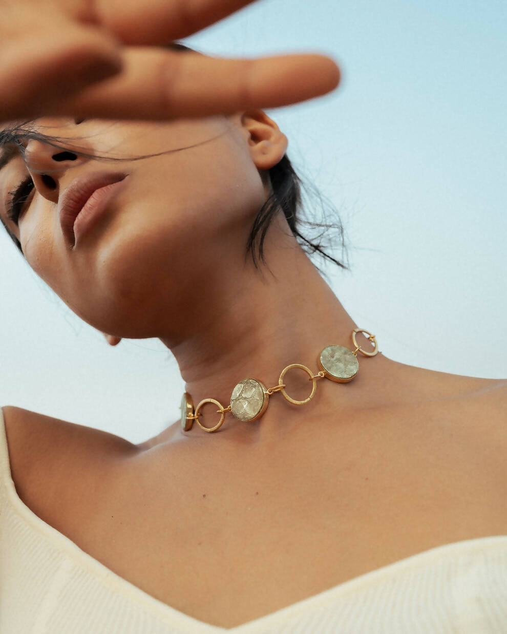 - Elevate your style with the Chainmail Choker – a stunning blend of gold-plated brass and silver leather wraps for a touch of glamour.