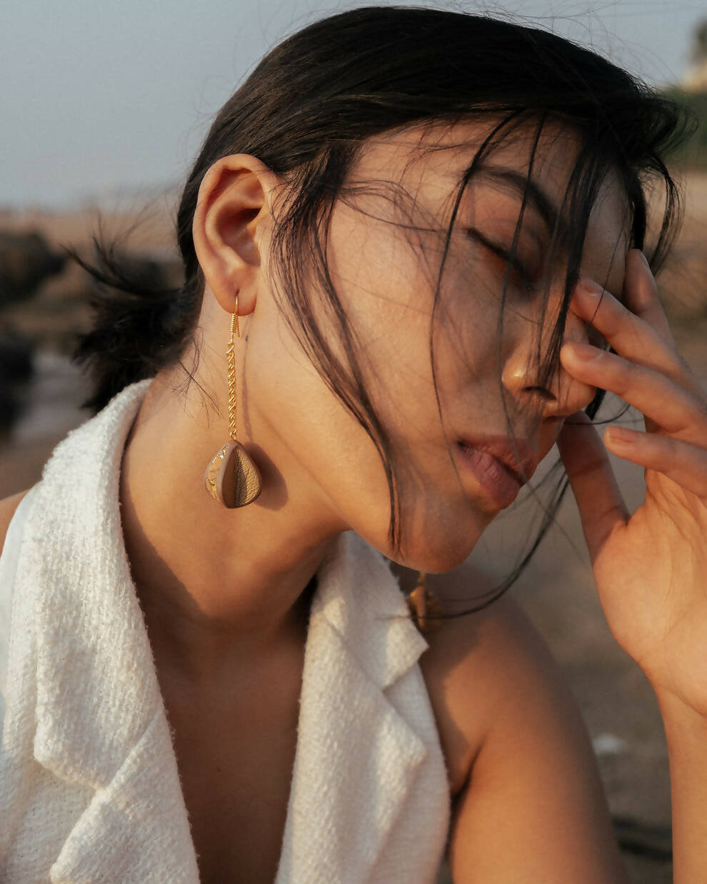 - Elevate your style with Drape Danglers – a fusion of leather, freckled cork, and gold accents for a uniquely chic look.