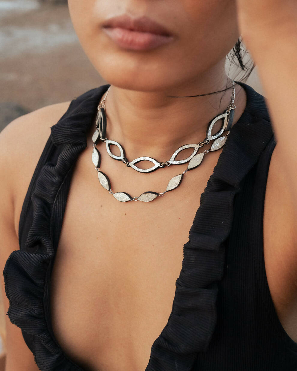 - Elevate your look with this eyelet choker, a fusion of patchy silver leather and edgy black accents that exude bold sophistication.
