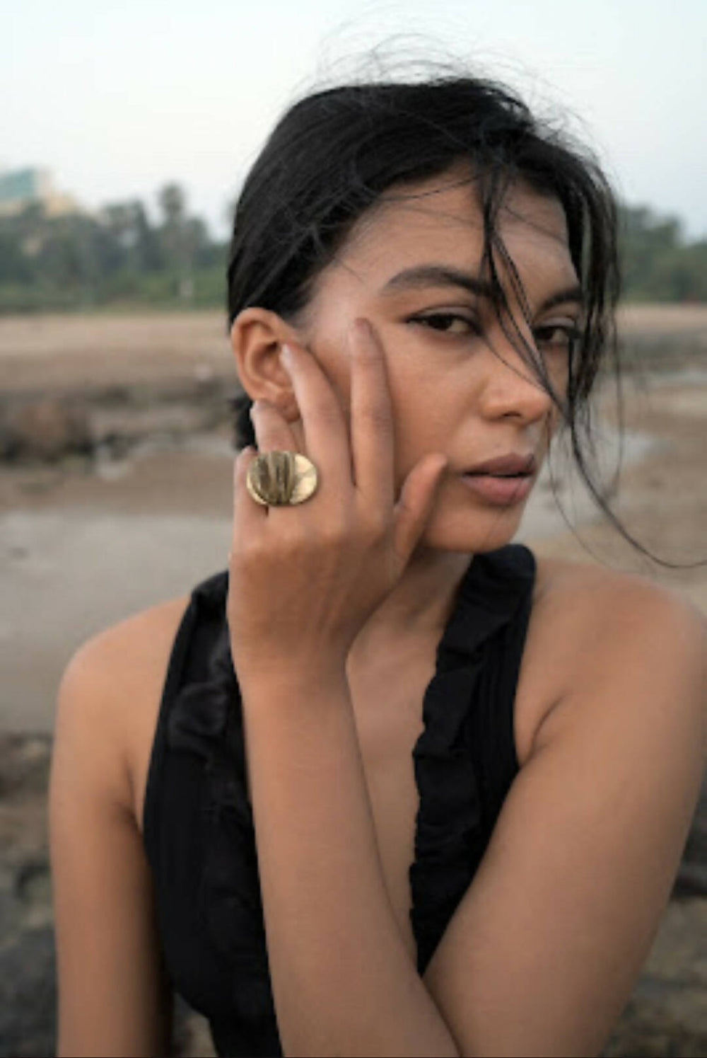 - Pair the Harmonica Ring with a chic black evening dress to create a harmonious contrast, allowing the shimmering gold and textured green leather to take center stage, adding a touch of dynamic elegance to your ensemble.