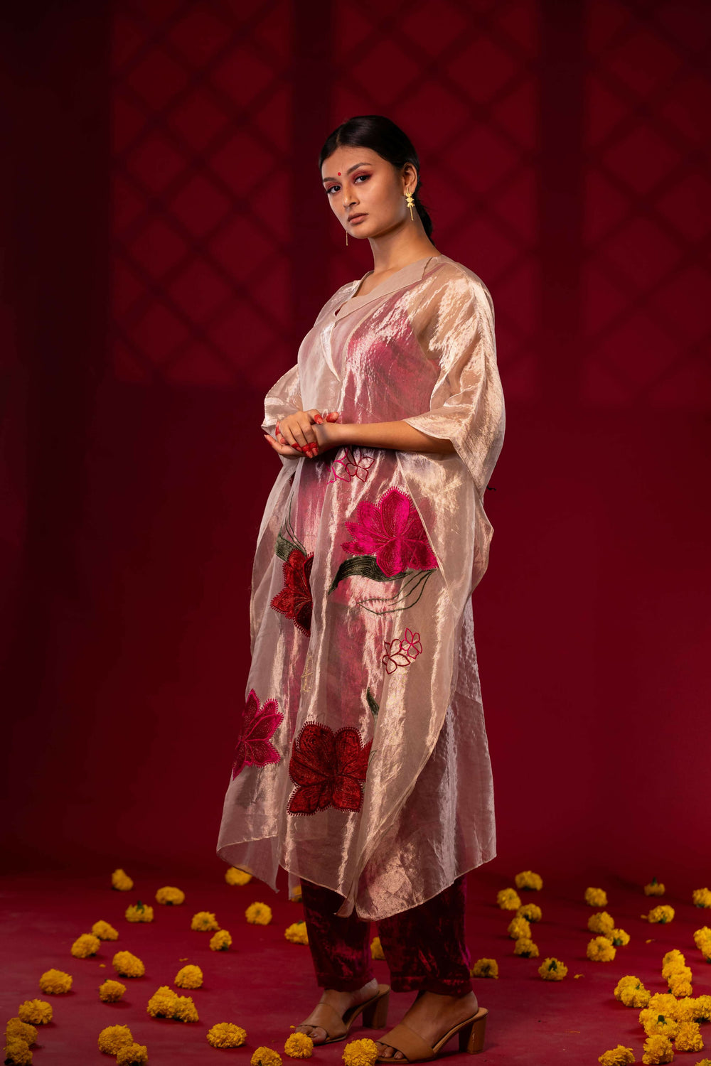 The relaxed fit of the kaftaan, with its collared yoke and 45” length, offers both style and comfort, embodying the luxurious feel of pure Banaras silk tissue handcrafted with love.