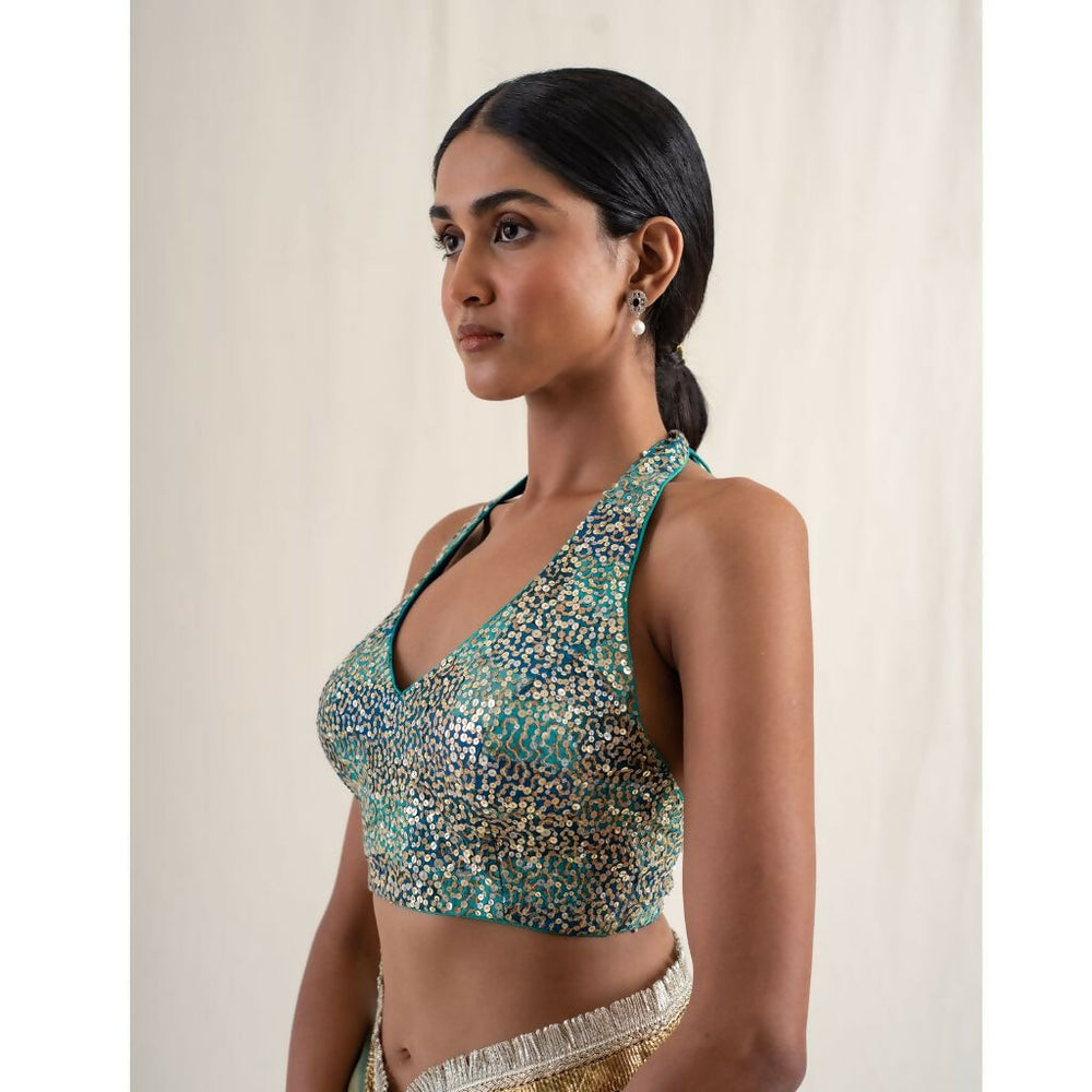 - Style this up as a waist coat or wear it a Designed to transcend trends, this blouse is a timeless addition to any wardrobe, promising to elevate your style with its blend of heritage-inspired charm and this features shades of teal in the patchwork with hand embroidered sequin clusters all over.Adorned with heavy tassels for added detail