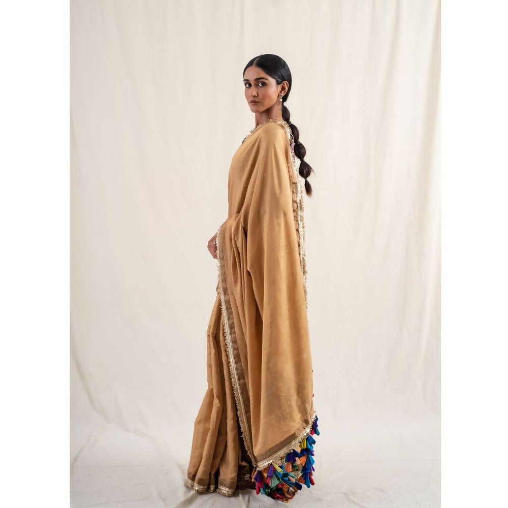 • Crafted from superb Gold silk Chanderi tissue saree with upcycled multicolor tassles on the palla, which is known for its delicate texture and lightweight feel, this saree offers an elegant drape that accentuates your silhouette.