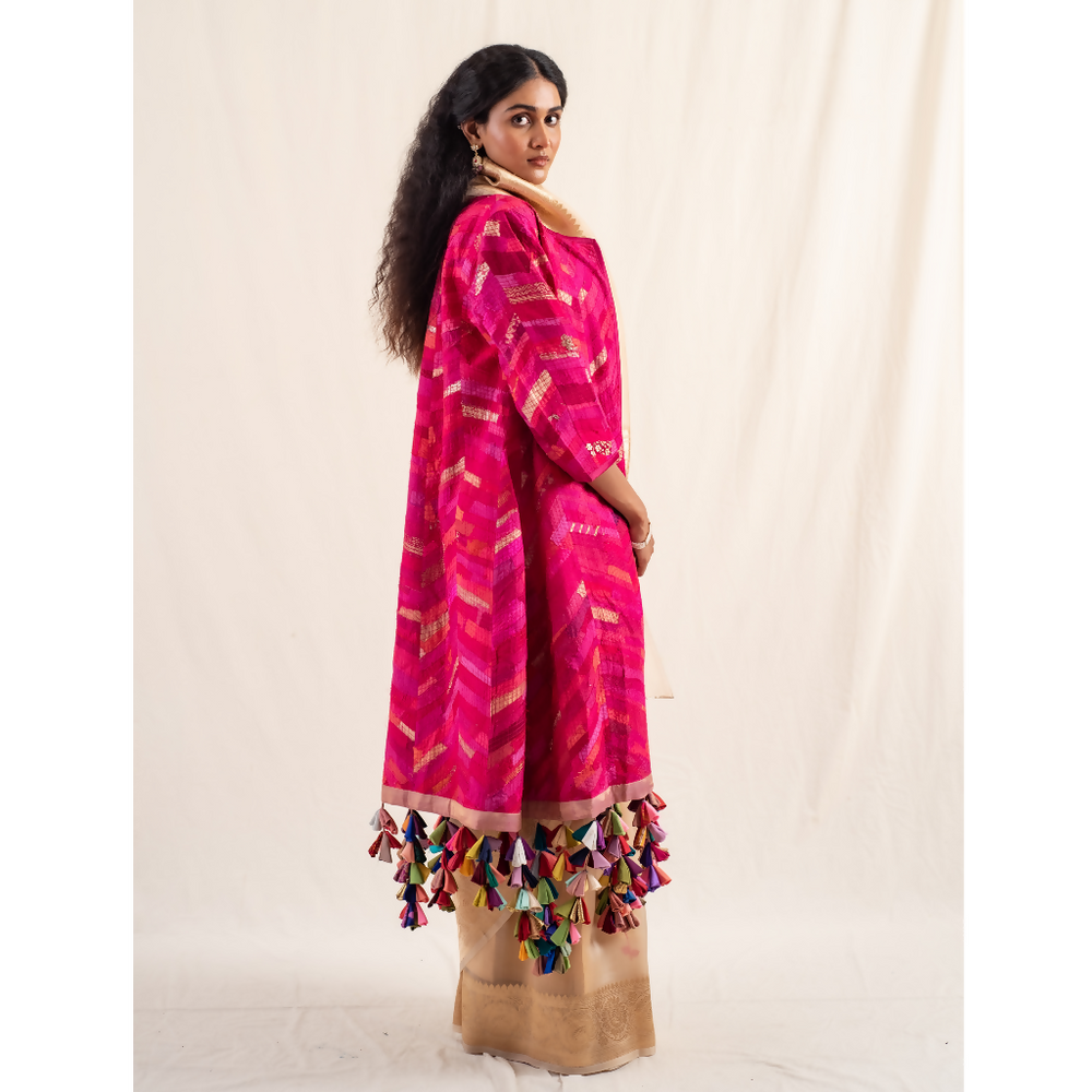 - A whimsical and homemade touch is added to the jacket by the multicolored, upcycled handmade tassels that are adorning the border. The addition of tassels to the jacket not only elevates its aesthetic appeal but also demonstrates ethical fashion choices.