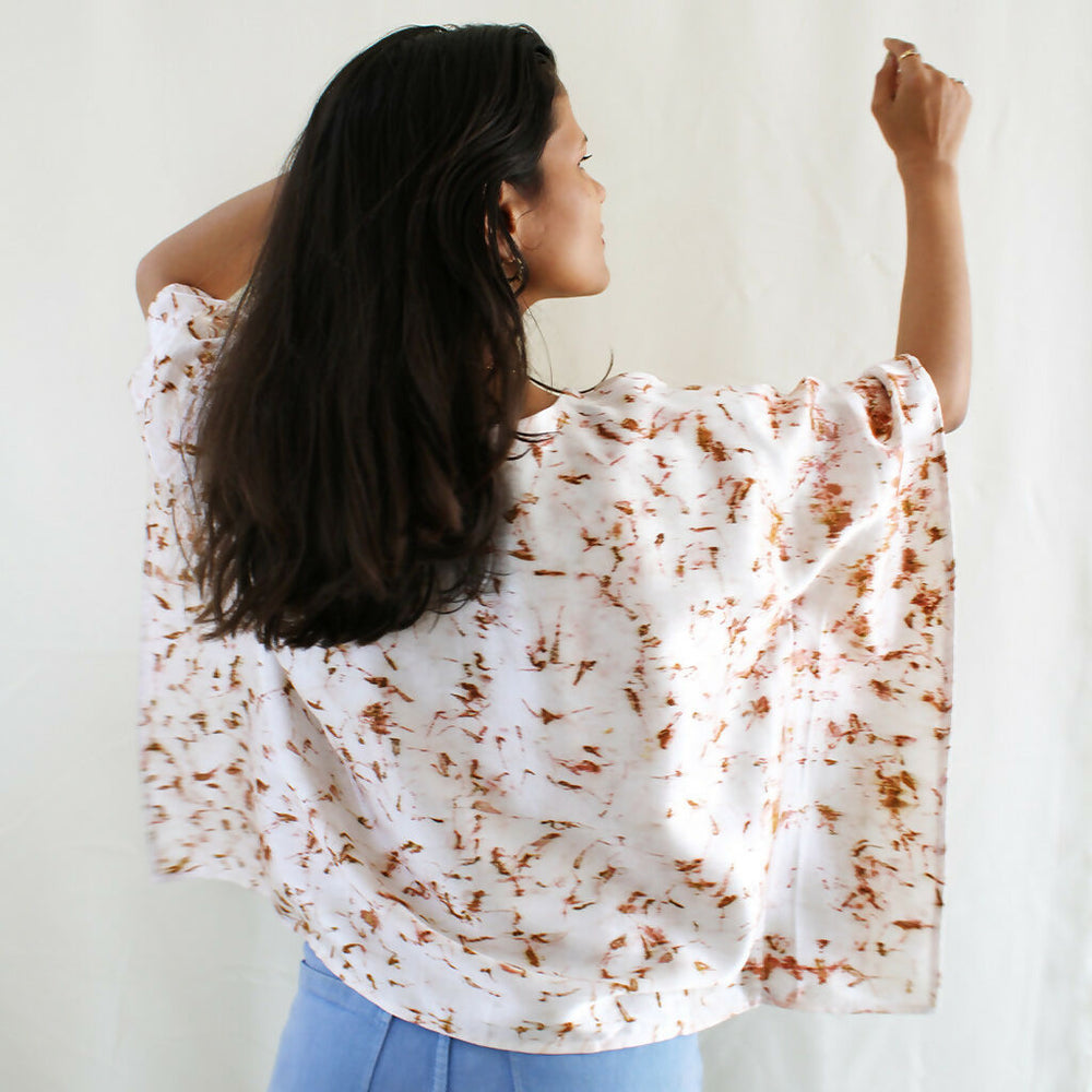 • Sourced from Patan, Gujarat, this top combines luxurious comfort with eco-consciousness, empowering traditional artisans. Designed in a relaxed kaftan silhouette, it's perfect for layering over shorts or skirts.