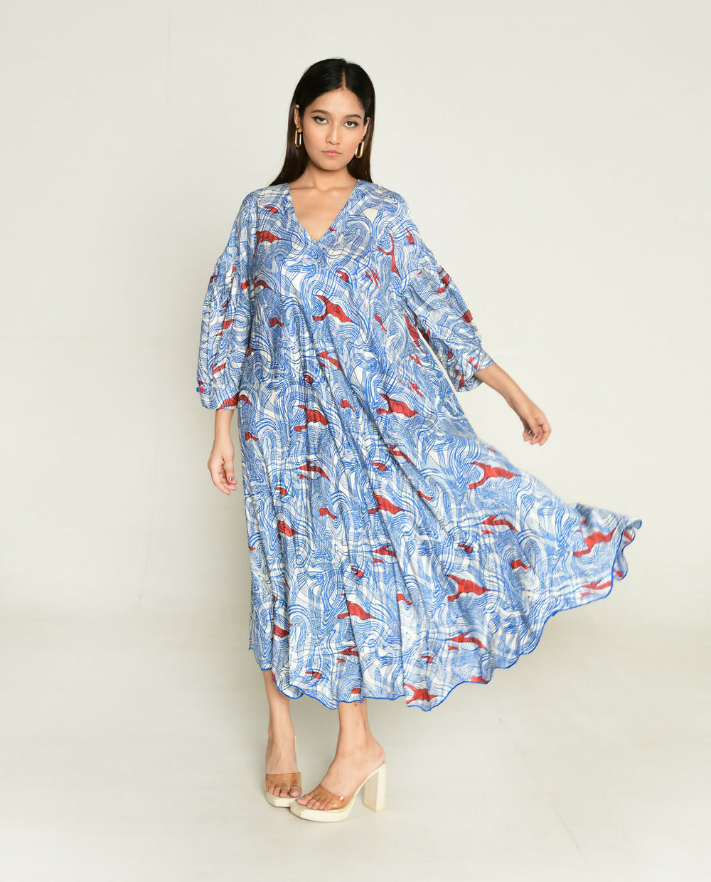 • This stylish Puff sleeve dress, made of opulent Cotton Bemberg fabric, is sure to turn heads. It is elegant and charming, with appealing block printing in a vivid multicolored palette.