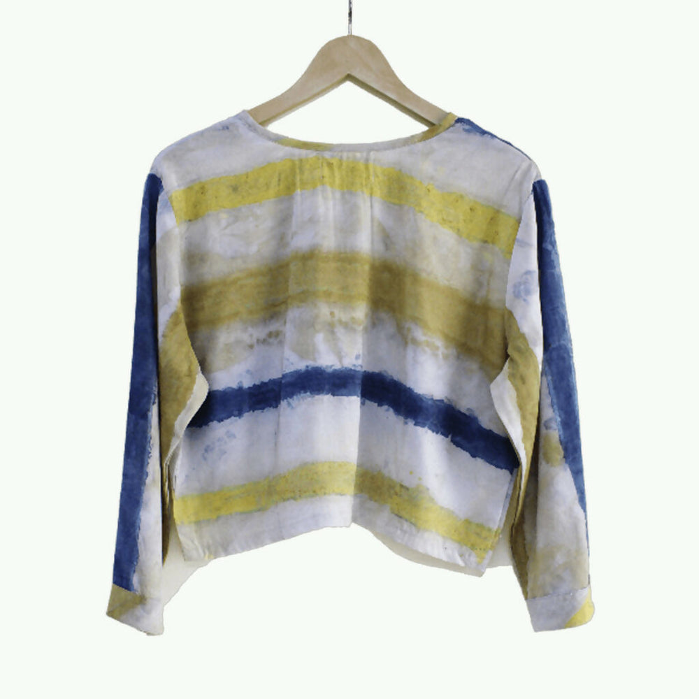 Rekha blouse is crafted from pure bamboo, handwoven by skilled artisans and dyed with natural elements like Indigo and Harda. This sustainable piece embodies cultural charm and timeless style, dyed using temple flowers and Ayurvedic herbs to avoid harmful synthetic dyes and minimize environmental impact.