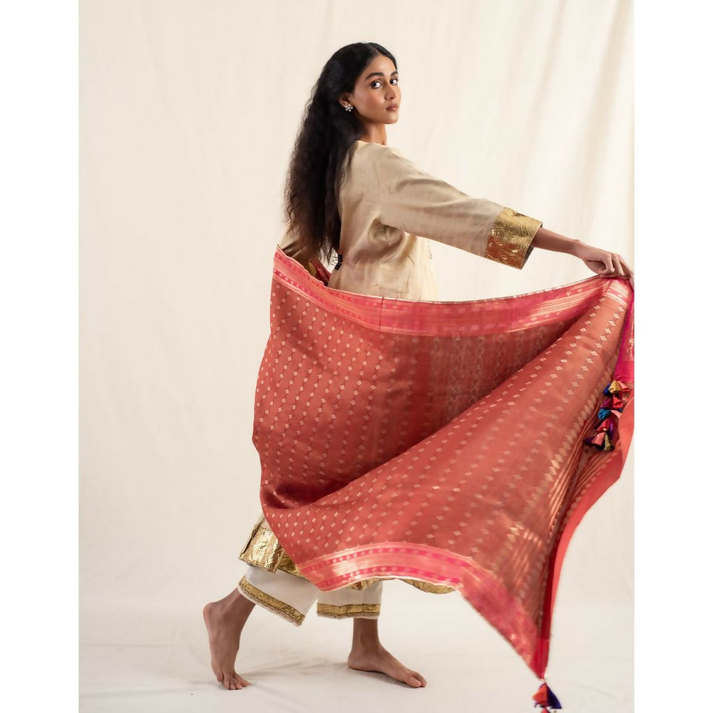 - This dupatta, which is made of banarasi silk which is Red in Colour with woven geometric designs all over. Multicolor upcycled hand made tassels on the corner., gives any ensemble an exquisite touch with its opulent texture and subdued luster.