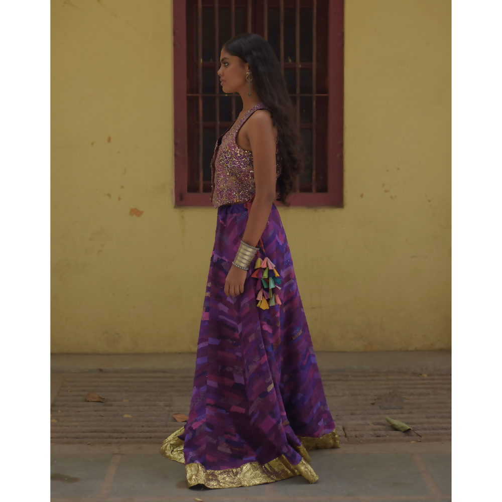 - This exquisitely crafted lehenga showcases a patchwork design that combines a variety of textiles, such as silks, satins, brocades, chikankari, prints, and hand weaves. Every patch narrates a tale about sustainable fashion and traditional creative forms.The lehenga has a captivating visual impact since it displays a range of purple hues, from subtle lavender tones to deep royal purples.