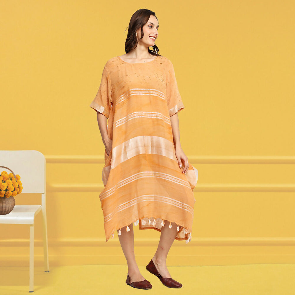 • Material: Made from slub cotton, this dress showcases intricate Zari weave detailing on the front and sleeves.