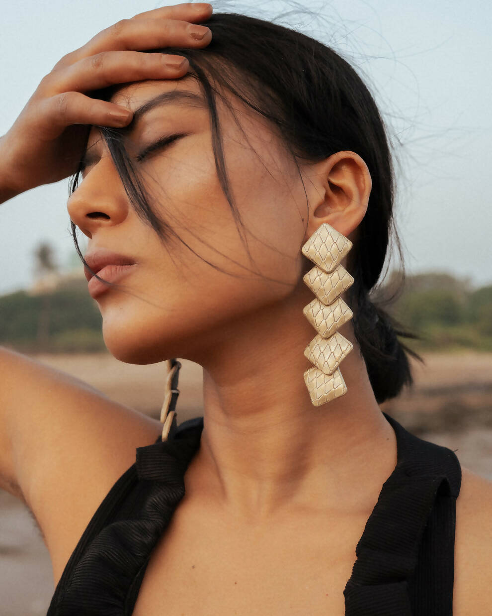 - Elevate your style with Tex danglers – a captivating fusion of layered cubes and chic croco embossed leather.