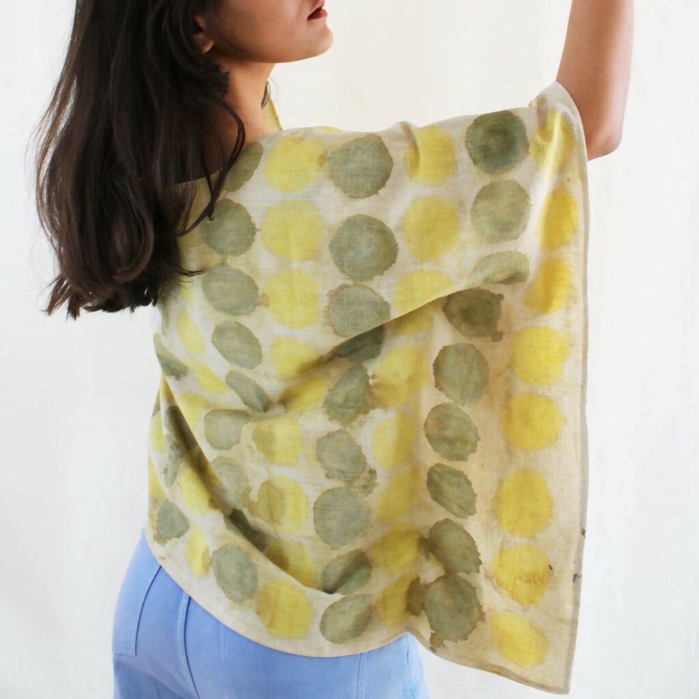 - Made from handspun organic cotton sourced from Kutch, Gujarat, it provides luxurious comfort while empowering traditional artisans. Polka dots dyed with ayurvedic herbs like harda and amba haldi showcase sustainability, reducing waste and protecting ecosystems.