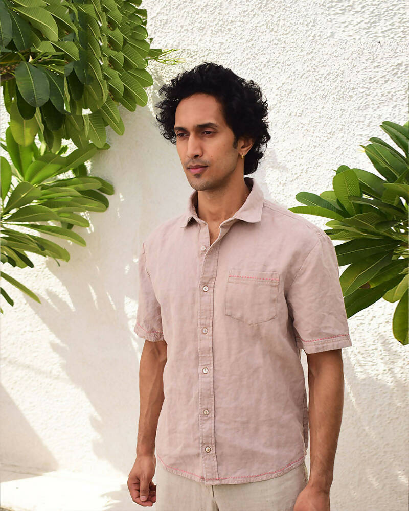 - Wear a half-sleeved linen shirt to feel the hug of nature. It has been dyed using myrobalan, pomegranate peels, and madder roots, giving it a delicate, gentle tone.