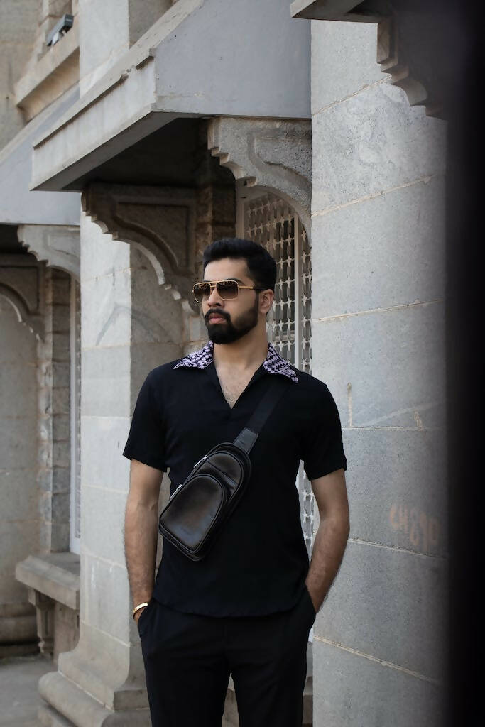 - Introducing our stylish black shirt featuring a unique printed collar!