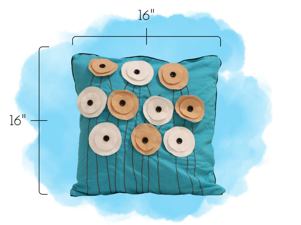 - Available in a beautiful colour combination of blue, white, and beige, this cushion cover is unique with its button design and vibrant pattern.