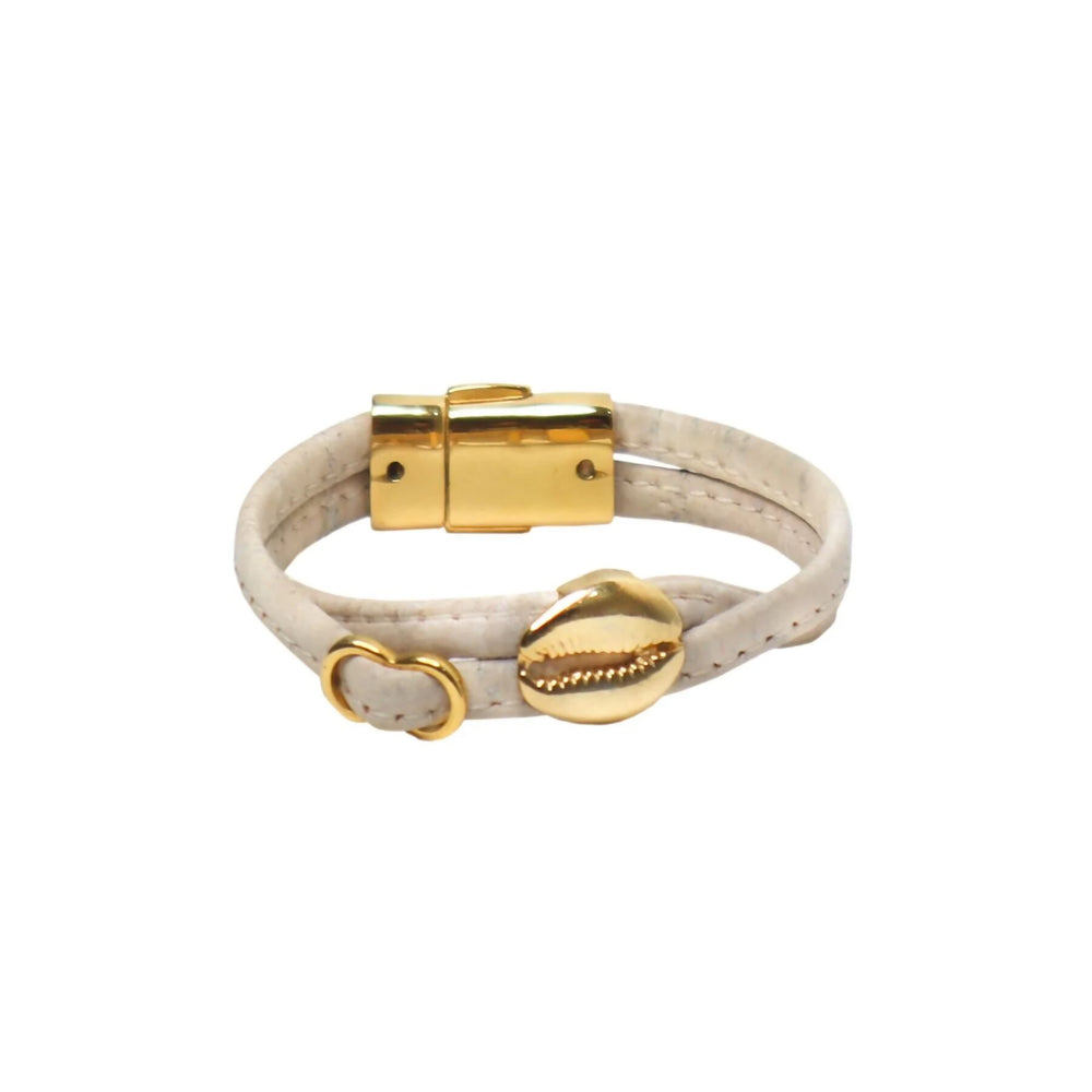 - Cowrie shell in gold and cork is a timeless addition to every attire. It's a spectacular statement of nature and style coming together, making it the ideal accessory for work or an evening outing.