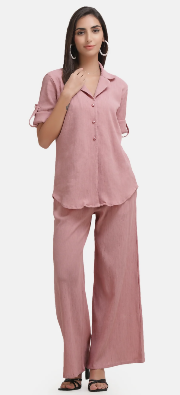 - Radiate charm in the Baby Pink Crinkled Crepe Coord Set, perfect for a sweet and feminine look; pair it with dainty accessories and strappy sandals for an effortlessly chic ensemble