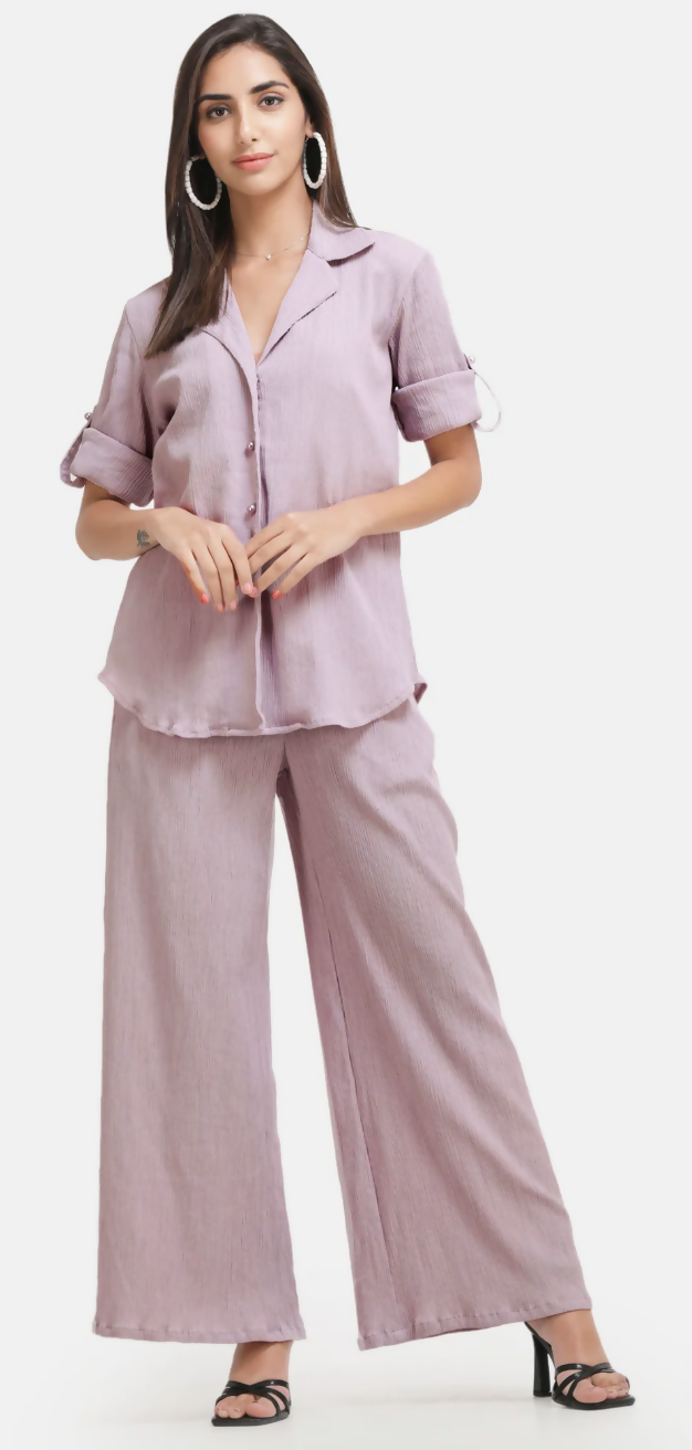 - Elevate your style in the Lilac Crinkled Crepe Coord Set, a graceful and versatile outfit that effortlessly transitions from day to night with the addition of heeled sandals and a statement clutch.