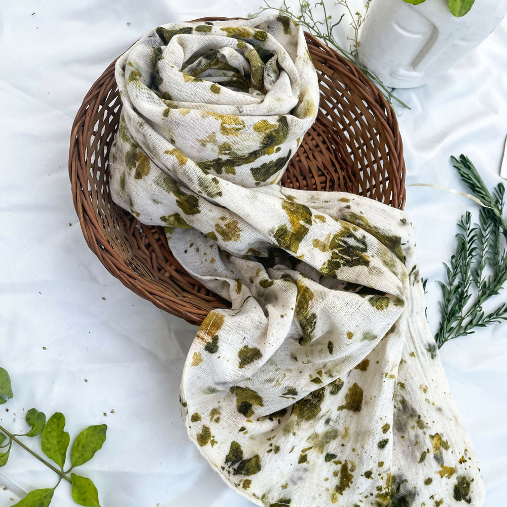 - Kala Cotton Stole is hand-dyed with flowers, Kitchen Waste, and natural dyes.