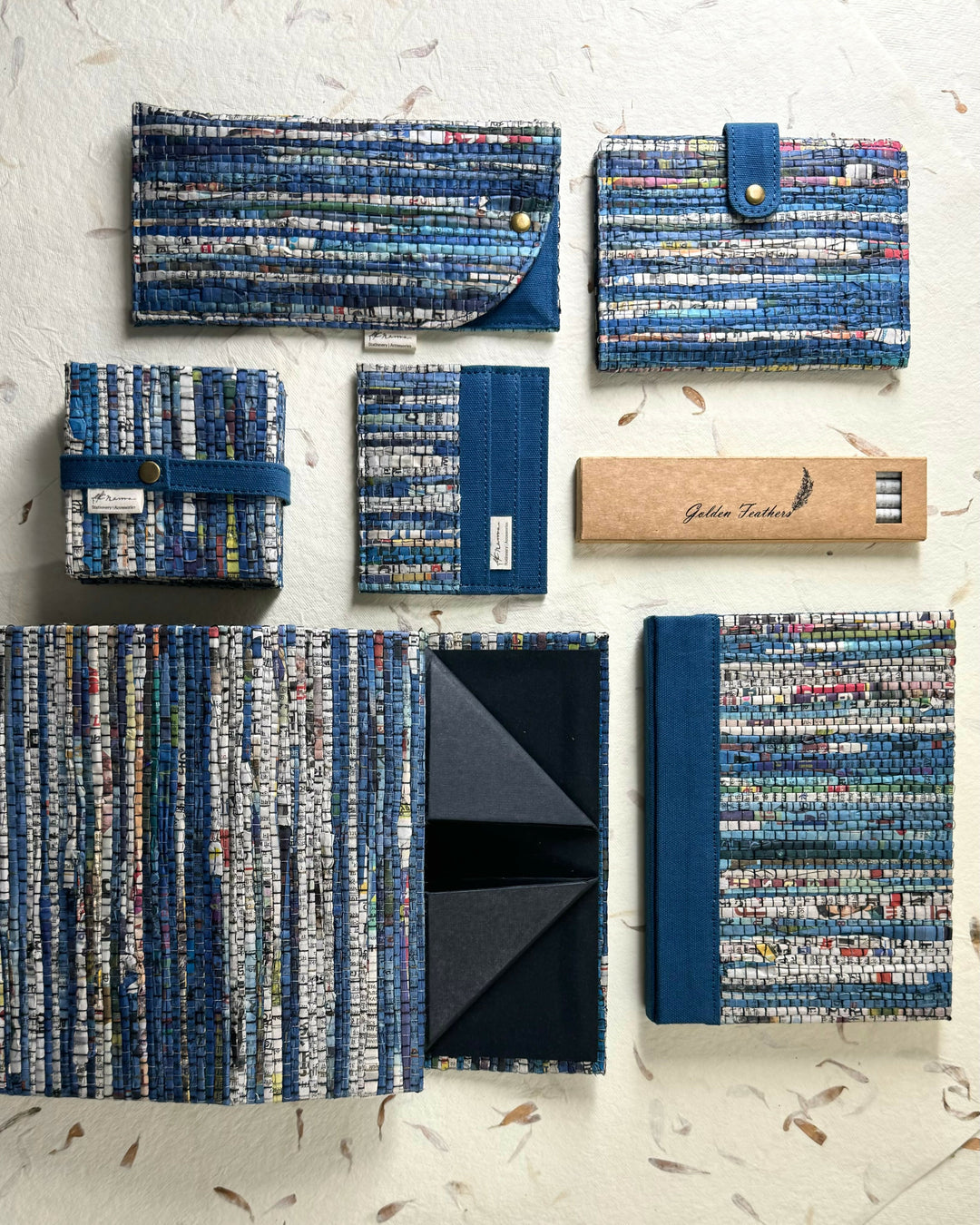• The set includes a card holder, passport holder, six coasters, an eyeglass holder, a handmade diary, and six pencils, all reflecting a cohesive and elegant design.