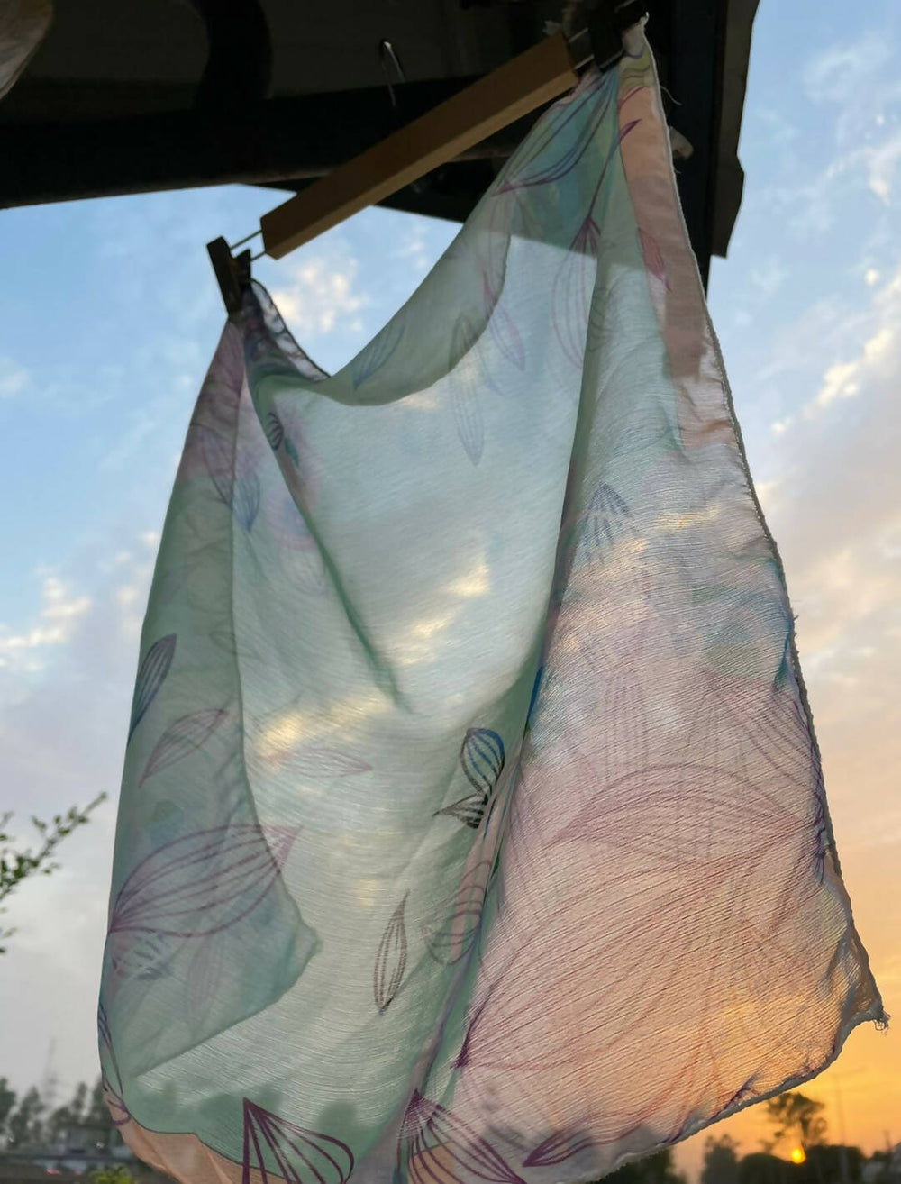 Our 'Tropical Scarf' is upcyled from factory leftover fabric waste. The fabric used is Chiffon which is semi sheer in nature. Inspired from nature this scarf is digitally printed in tropical pattern. This scarf can be used as a bandana/hairtie.