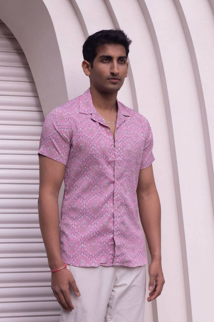 • Introducing our elegant baby pink lapel collar shirt, meticulously crafted with a subtle print that exudes sophistication.