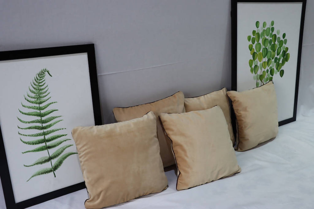 This is a set of 5 cushion covers that have been upcycled from leftover champagne-colored sofa fabric to give you more reasons to believe that upcycling is fun!