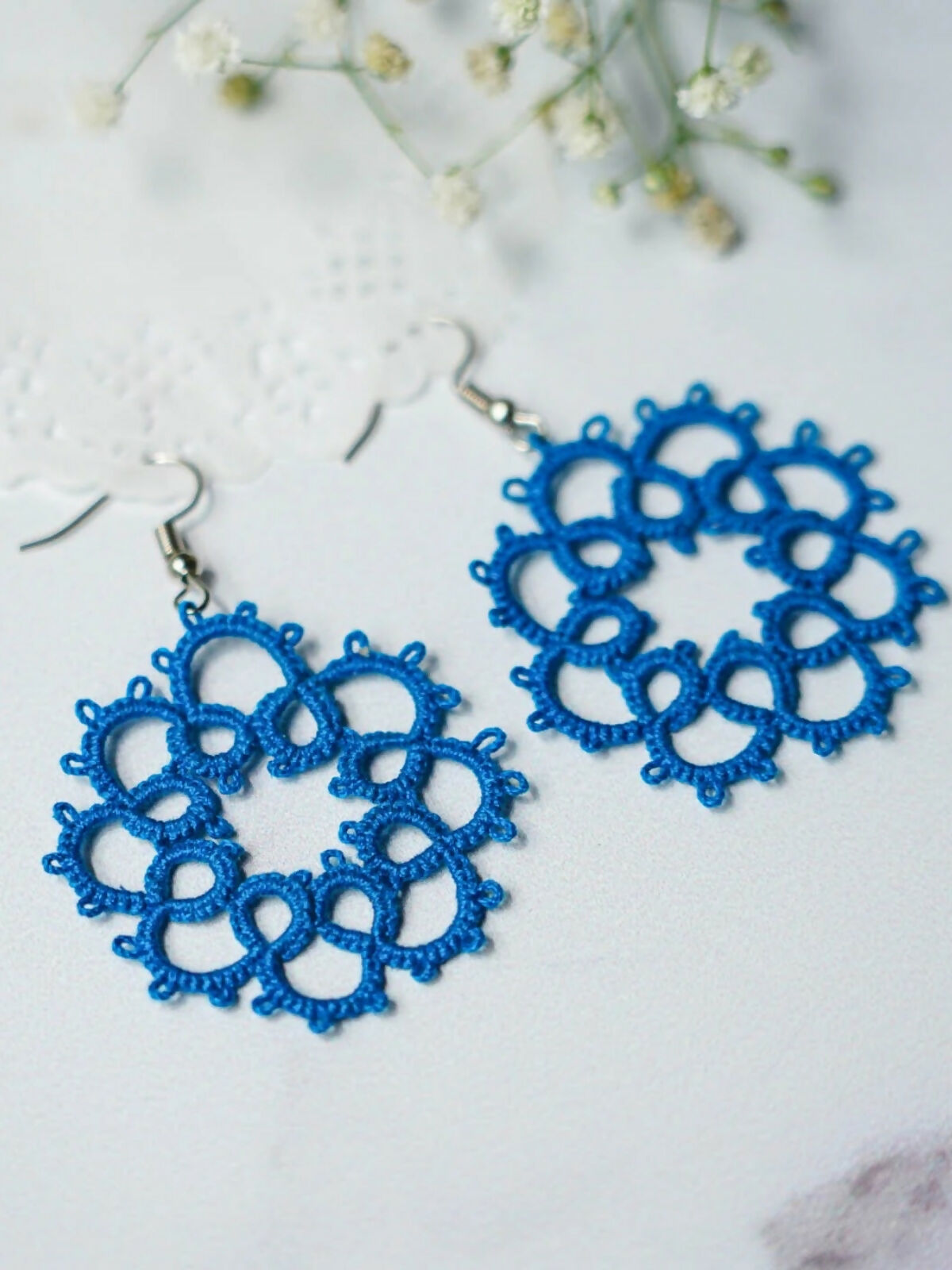 - The Azure Dream Earrings showcase exquisite craftsmanship, intricately woven from cotton thread using the traditional tatting technique, resulting in stunning lacework that embodies elegance and artistry.