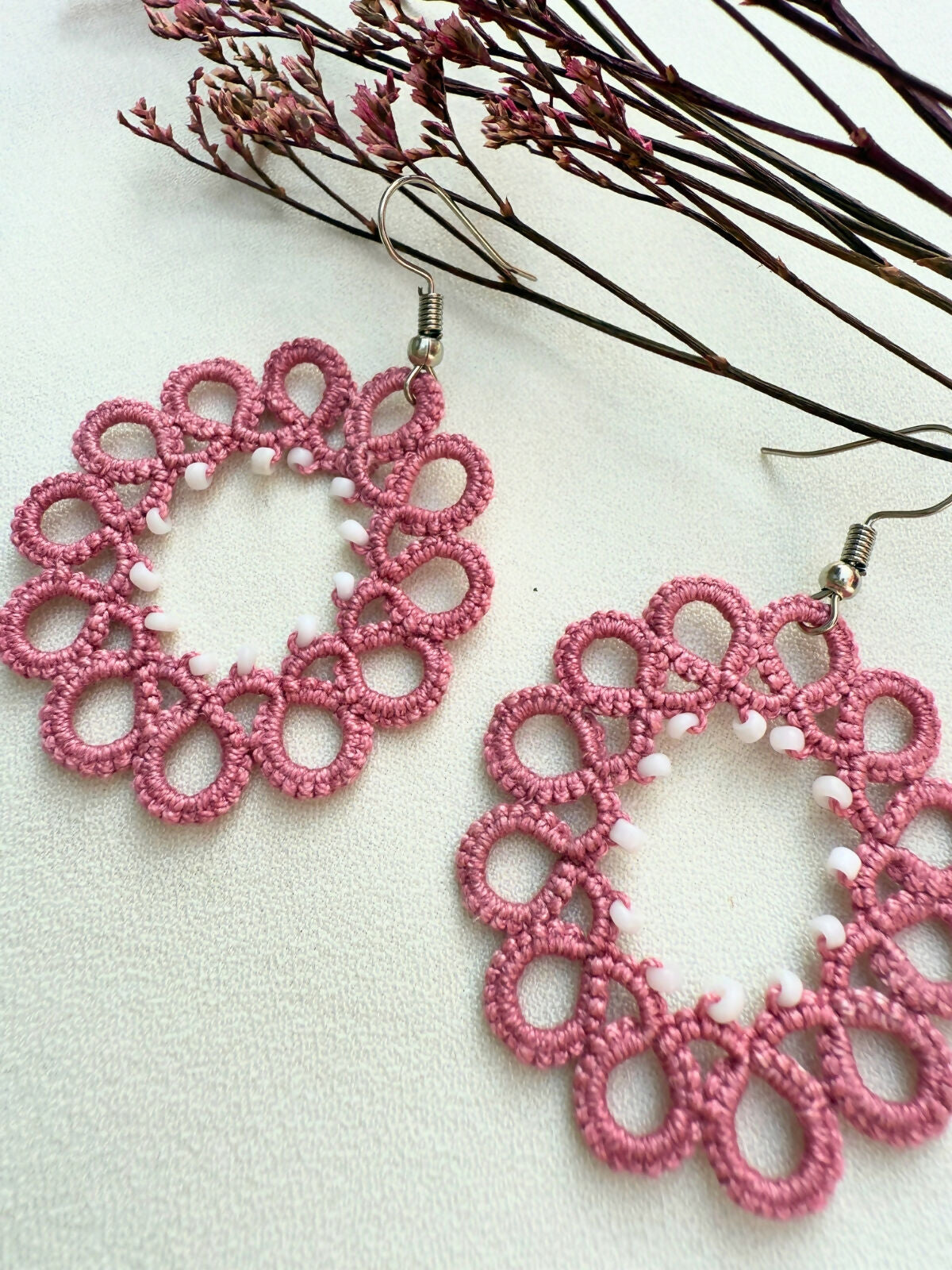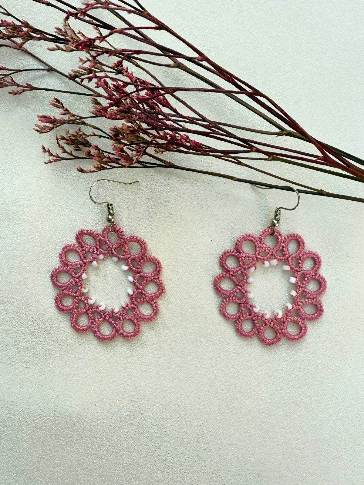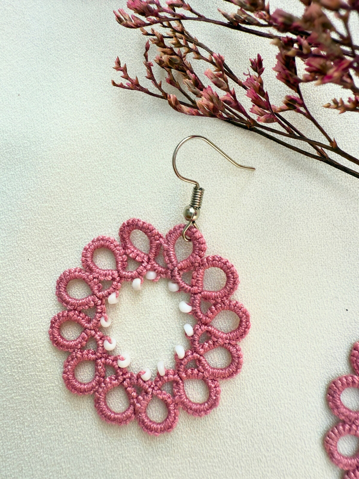 • These boho rosette earrings showcase delicate floral motifs in pink, expertly crafted using the age-old art of shuttle tatting with fine cotton thread.
